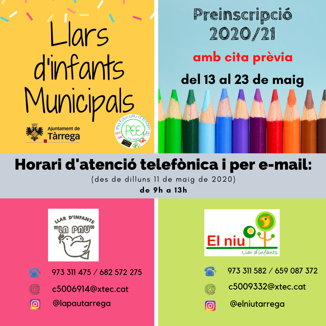 Per la seva part, les dues llars d’infants municipals de Tàrrega, La Pau i El Niu, preveuen obrir el període de preinscripció per al curs 2020 – 2021 el proper dimecres 13 de maig, el qual s'allargarà fins al dia 23 del mateix mes, de 9 del matí a 1 del migdia. Prèviament, a partir del dilluns 11 de maig les dues llars d’infants atendran consultes i resoldran dubtes en el mateix horari, de 9 del matí a 1 del migdia, per via telefònica i telemàtica.