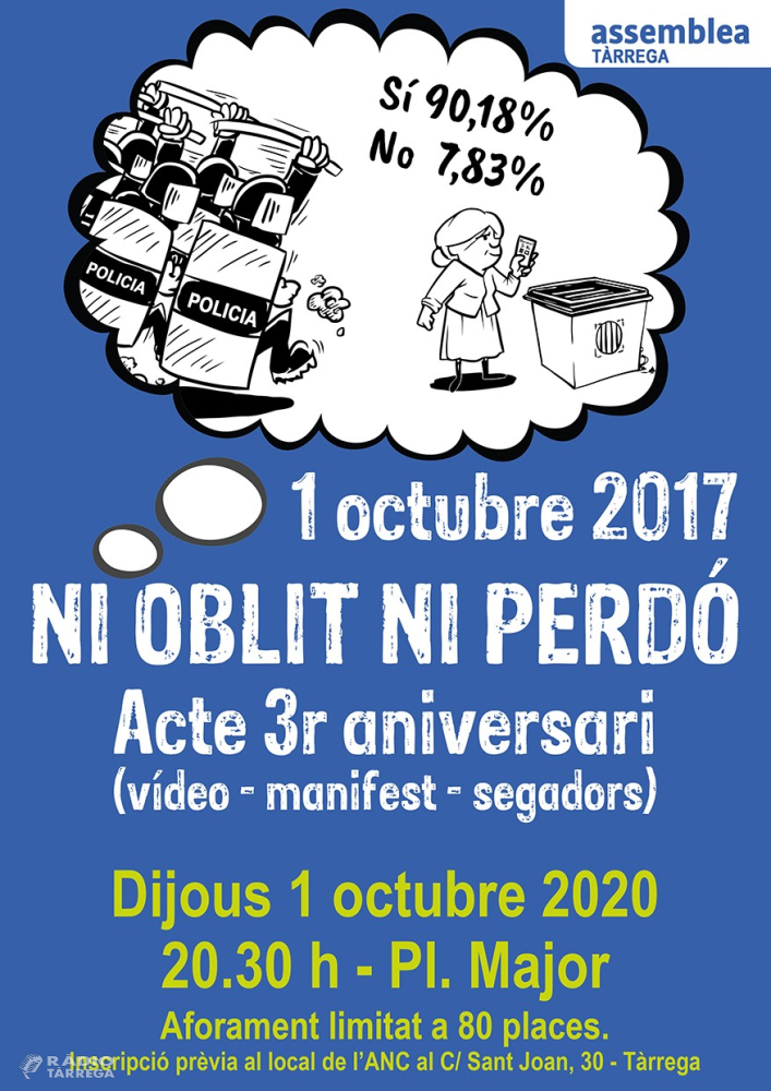 Avui dijous 1 d’octubre es celebra el tercer aniversari de la celebració del Referèndum del 1 d'octubre de 2017. Des de l’ANC Tàrrega per la Independència organitzen per aquest vespre una concentració ciutadana.